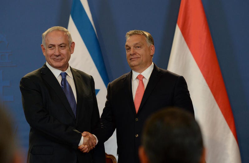 Benjamin Netanyahu and Viktor Orban hold a joint press conference at the Parliament building in Budapest in 2017. (Haim Zach/GPO)