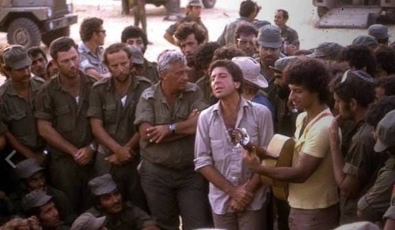Leonard Cohen singing for soldiers during the 1973 Yom Kippur War, with General—and future Prime Minister—Ariel Sharon on the left and Israeli musician Matti Caspi on the right.