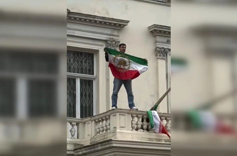 A protester takes down the flag from Iran’s London embassy and replaces it with a pre-Islamic revolution flag yesterday. (Screengrab used in accordance with Section 27a of the Copyright Law/X)