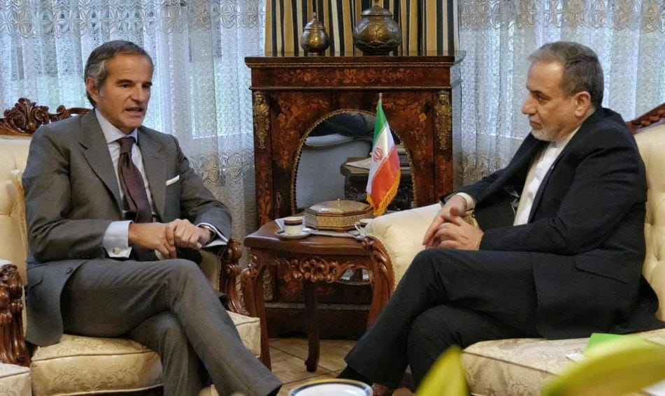 Iranian Foreign Minister Abbas Araghchi meeting with International Atomic Energy Agency Director-General Rafael Grossi in Geneva yesterday. (Iranian Foreign Ministry)