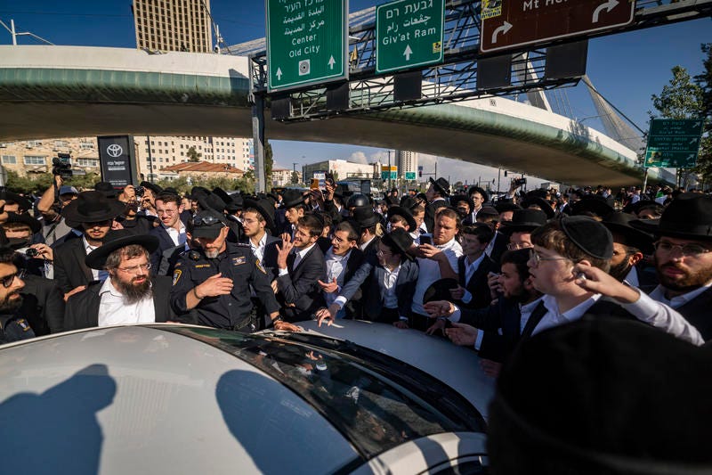 Ultra-Orthodox Jewish men block a road and clash with police at the entrance to Jerusalem during a protest against the jailing of seminary students who failed to comply with an army recruitment order. (Yonatan Sindel/Flash90)