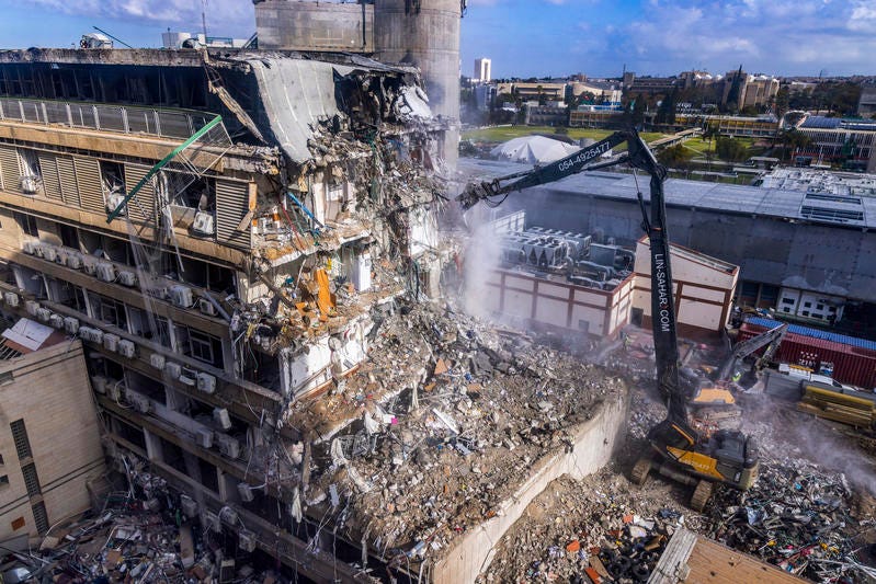 Heavy machinery demolishes a building damaged by a ballistic missile during the war with Iran at Soroka Medical Center in Be’er Sheva yesterday. (Yossi Aloni/Flash90)