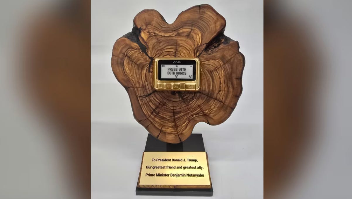 When Netanyahu walked into Donald Trump’s office for the first time during the former’s second term, he brought a small gift: a golden beeper embedded in a piece of cedar, dedicated to “our great friend and greatest ally.” Trump was delighted. What followed was a warm meeting, described by the Israeli delegation as “beyond our expectations and dreams.” The lesson? Trump likes gifts.