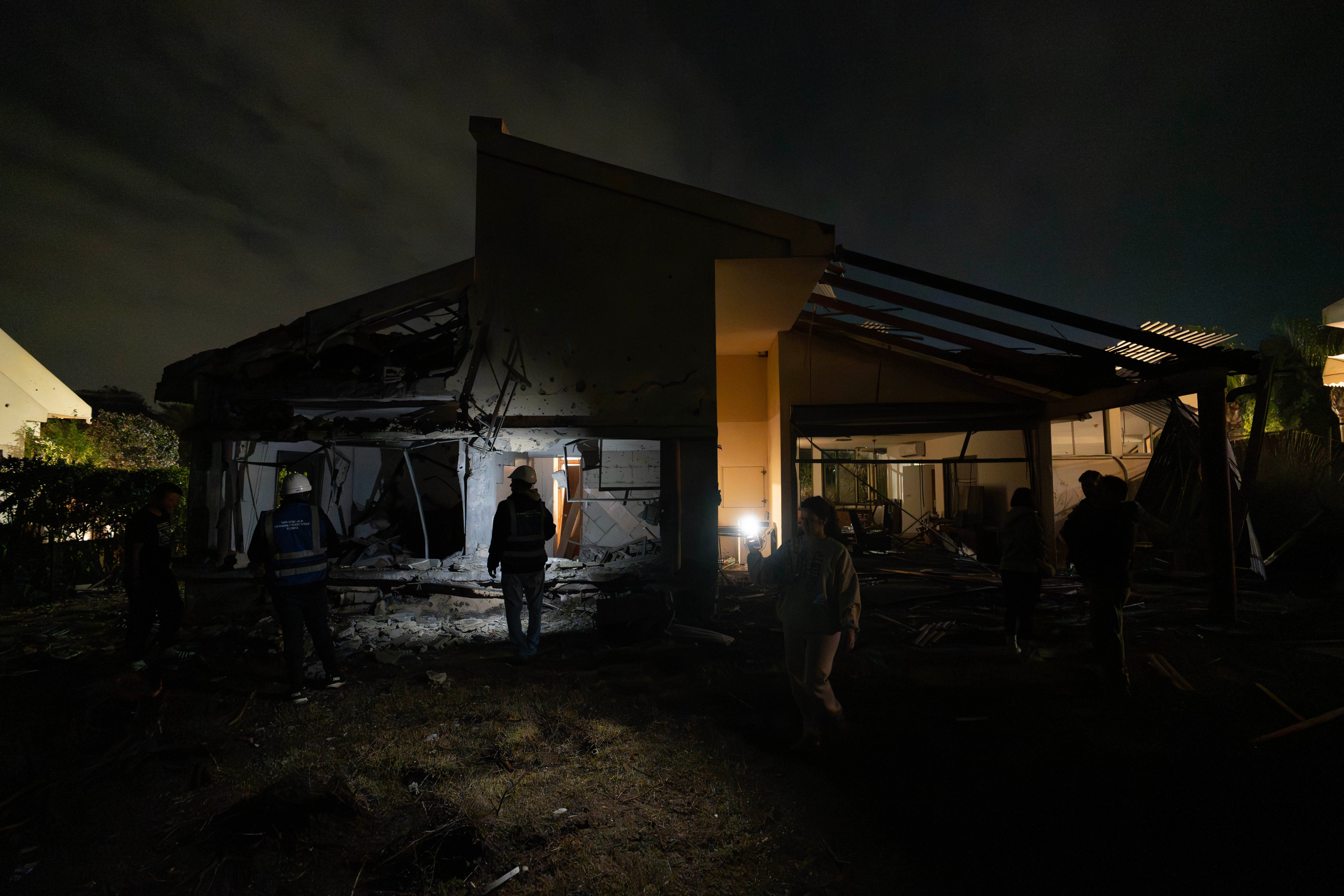 People stand at the scene where a house was hit by a Hezbollah missile in Moshav Hani’el last night. (Chen Leopold/Flash90)