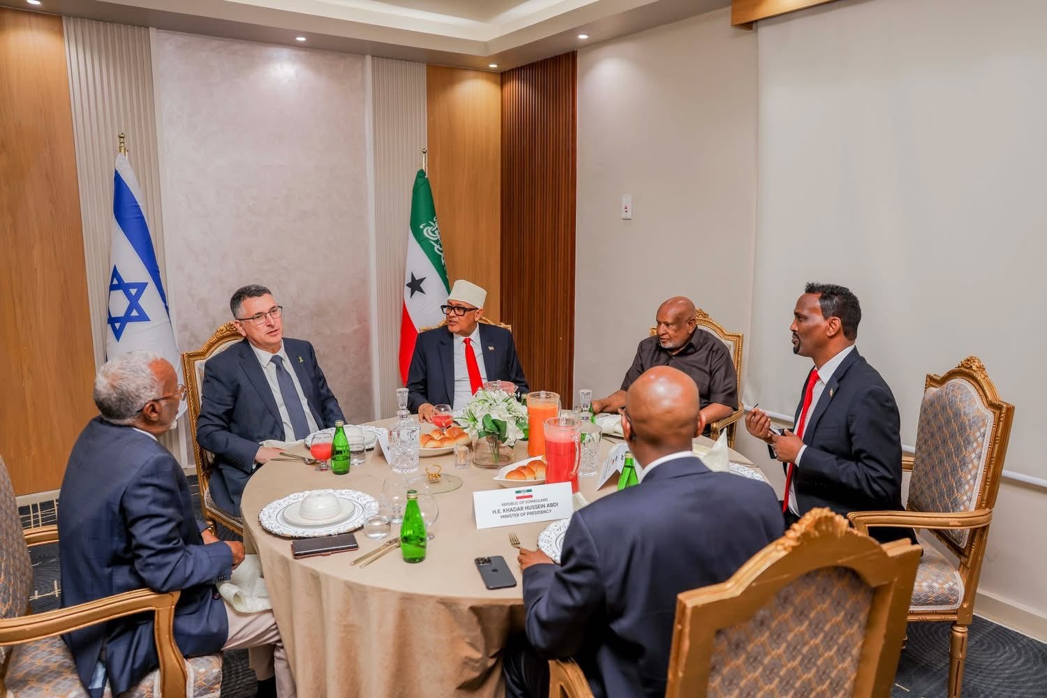 Israel’s Foreign Minister Gideon Sa’ar meeting with Somaliland’s President Abdirahman Mohamed Abdullahi and other officials.(@AmbMohamedHagi/X)